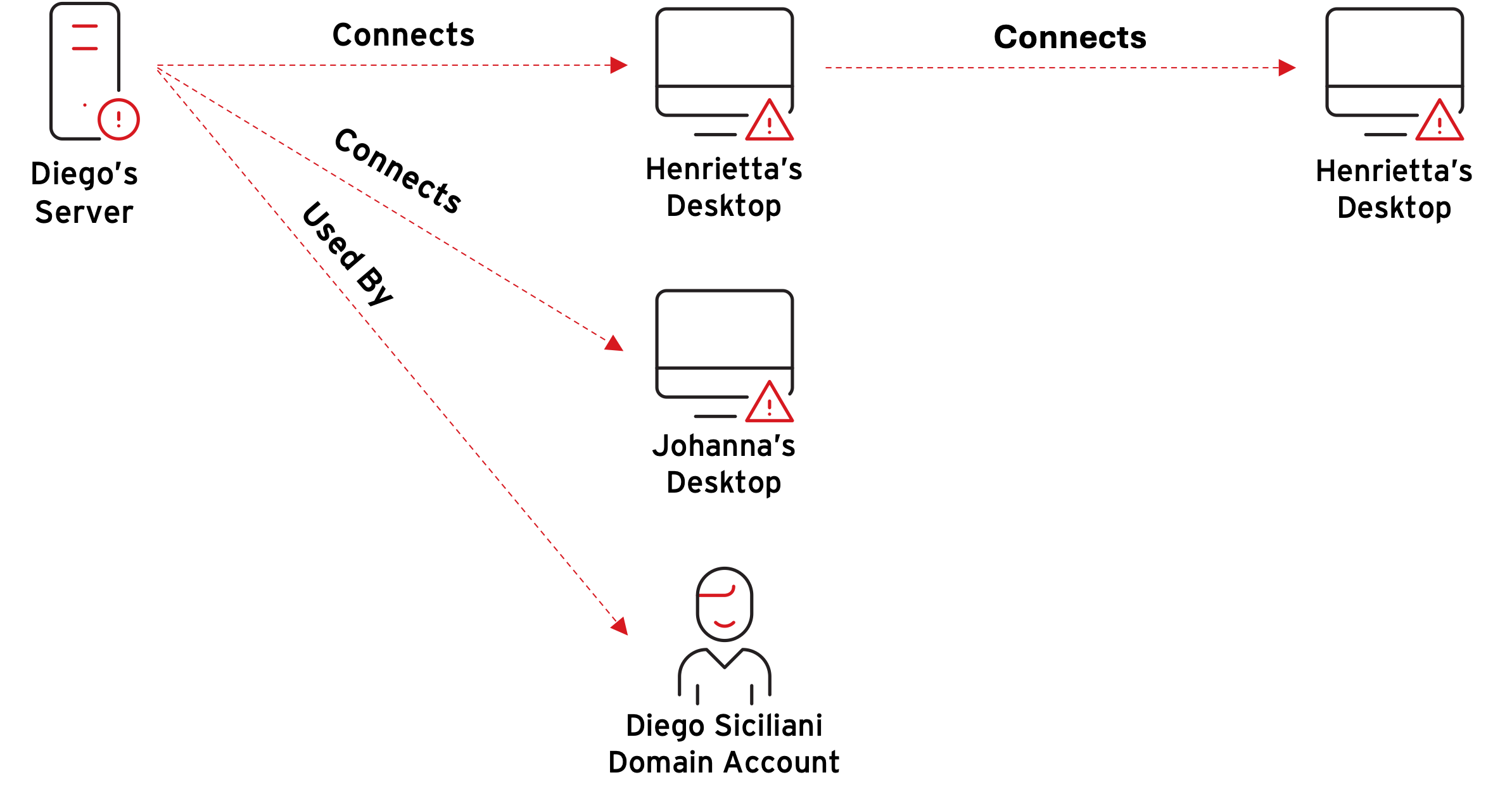 دوم، آنها از پیشبینی مسیر حمله استفاده میکنند تا ببینند کدام کاربران روی مسیرهای حرکت جانبی حیاتی قرار دارند. آنها میبینند که یک حمله میتواند دستگاه در معرض اینترنت را به خطر بیندازد و از طریق نقاط پایانی بهصورت جانبی حرکت کند و در نهایت به حساب دامنه با دسترسیهای بالا برسد. آنها بهصورت پیشگیرانه آموزش آگاهی را به کاربران متصل ارائه میدهند.