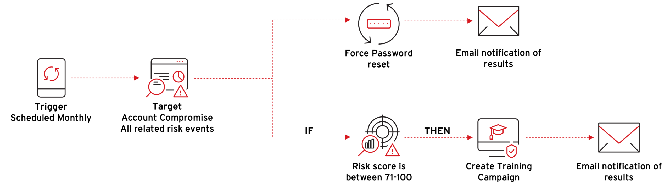 ابتدا، آنها گردشهای کاری خودکار را برای صرفهجویی در زمان و تلاش راهاندازی میکنند. بنابراین، هنگامی که ابزار نشانگرهای سازش حساب کاربری را شناسایی میکند، بهطور خودکار بازنشانی رمز عبور را برای حساب مربوطه اجبار میکند و اعلانهای ایمیل را با جزئیات به تیم امنیتی ارسال میکند. برای تقویت رفتار امن و جلوگیری از تکرار، آموزش آگاهی مرتبط را درباره محافظت از رمز عبور و احراز هویت چندعاملی (MFA) به کاربر آسیبدیده ارائه میدهد.
